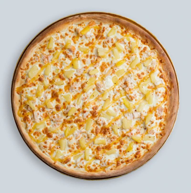 Тесто дрожжевое, соус ранч, куриное филе запеченное, моцарелла, ананас, кисло-сладкий соус
