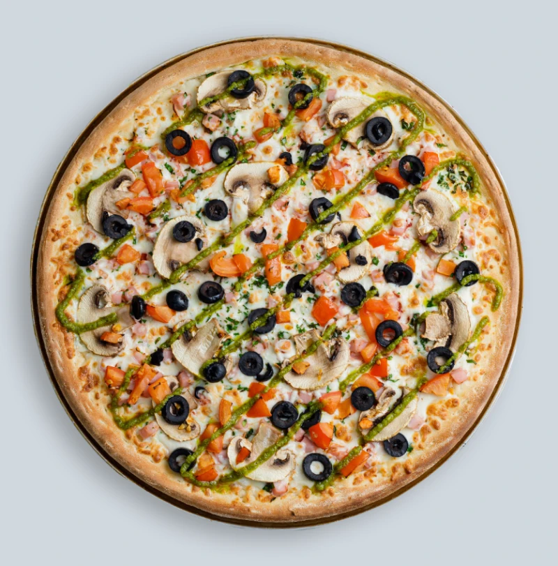 Тесто дрожжевое, соус томатный, огурчики маринованые, томаты, лучок, маслины, перец болгарский, соус песто
